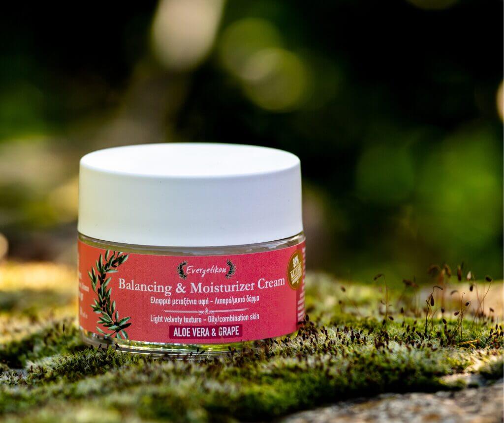 De Evergetikon Moisturizing Face Balancing Cream, met Aloë Vera als belangrijk ingrediënt, biedt natuurlijke hydratatie en heeft een zijdezachte, lichte textuur die snel door de huid wordt opgenomen. Het antioxidante lichte druivenolie, rijk aan polyfenolen, beschermt de huid, stimuleert de collageenproductie, verjongt huidcellen en vertraagt het verouderingsproces van de huid. Het is geschikt voor een vette en gecombineerde huid. Breng een kleine hoeveelheid van de crème aan op het gezicht en de hals met zachte, cirkelvormige bewegingen. Werkt uitstekend als make-up basis.