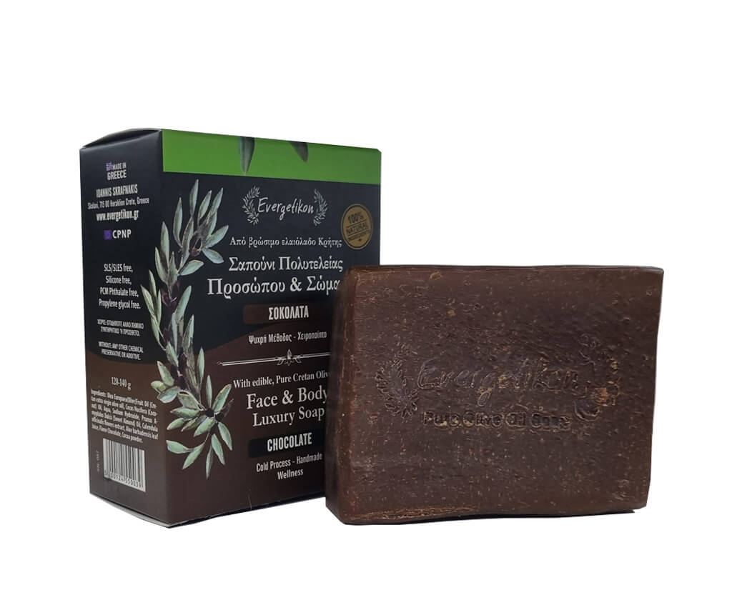 Ingrediënten: Olea Europaea (olijf) fruitolie, Kretenzische extra vierge olijfolie, Cocos Nucifera (kokosnoot) olie, aqua, natriumhydroxide, Prunus Amygdalus Dulcis (zoete amandel) olie, extract van calendula officinalis bloemen, sap van aloë barbadensls, chocoladesmaak, Cacaopoeder.